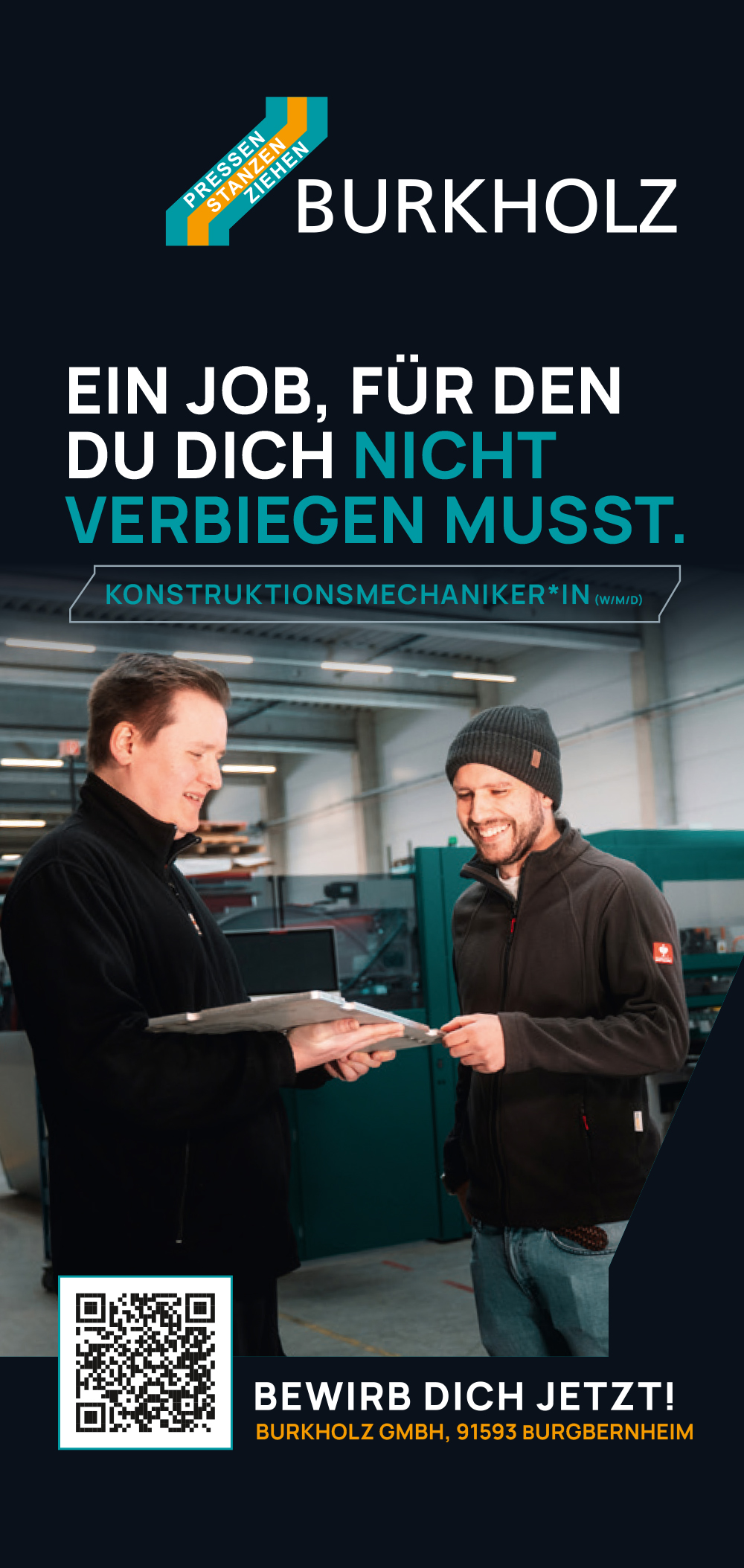 Seit über 80 Jahren steht BURKHOLZ für Qualität, Kundenzufriedenheit und Liefertreue. In unserem modernen Firmengebäude in Burgbernheim fertigen wir auf 5.500 m² Einzelteile, Klein- und Großserien nach Zeichnung und auf Kundenwunsch. Unser Unternehmen setzt auf die Förderung junger Talente und bietet dir eine vielseitige, fundierte Ausbildung mit hervorragenden Zukunftsperspektiven!